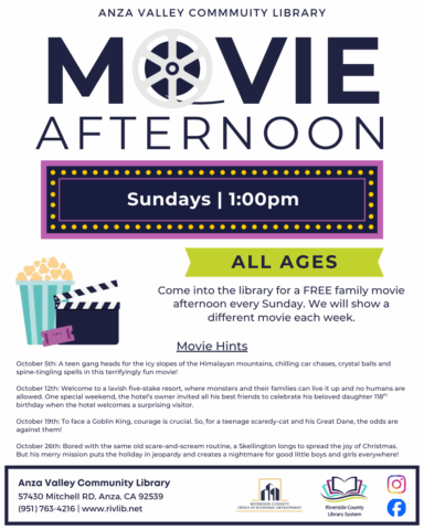 Come into the library for a FREE family movie afternoon each Sunday. A different movie will show each week.