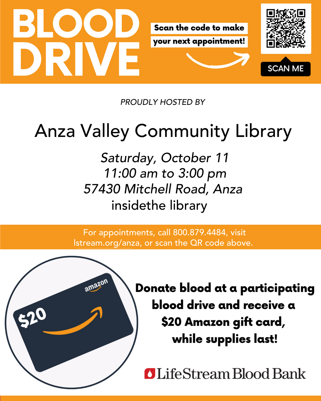Save lives in your community and donate blood! Sign up today! Call 800.879.4484 or visit LStream.org/anza
