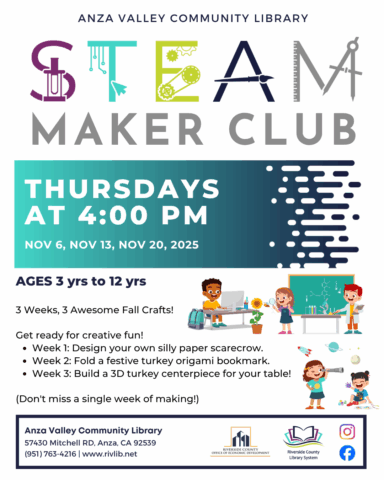 On Thursdays, we will have an activity based on S.T.E.A.M. These activities for children to learn something about Science, Technology, Engineering, Art or Math. All are welcome to join in, though younger children may need assistance from their parents