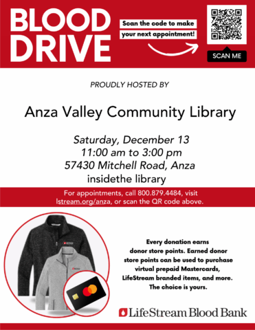 Save lives in your community and donate blood! Sign up today! Call 800.879.4484 or visit LStream.org/anza