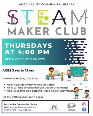 On Thursdays, we will have an activity based on S.T.E.A.M. These activities for children to learn something about Science, Technology, Engineering, Art or Math. All are welcome to join in, though younger children may need assistance from their parents
