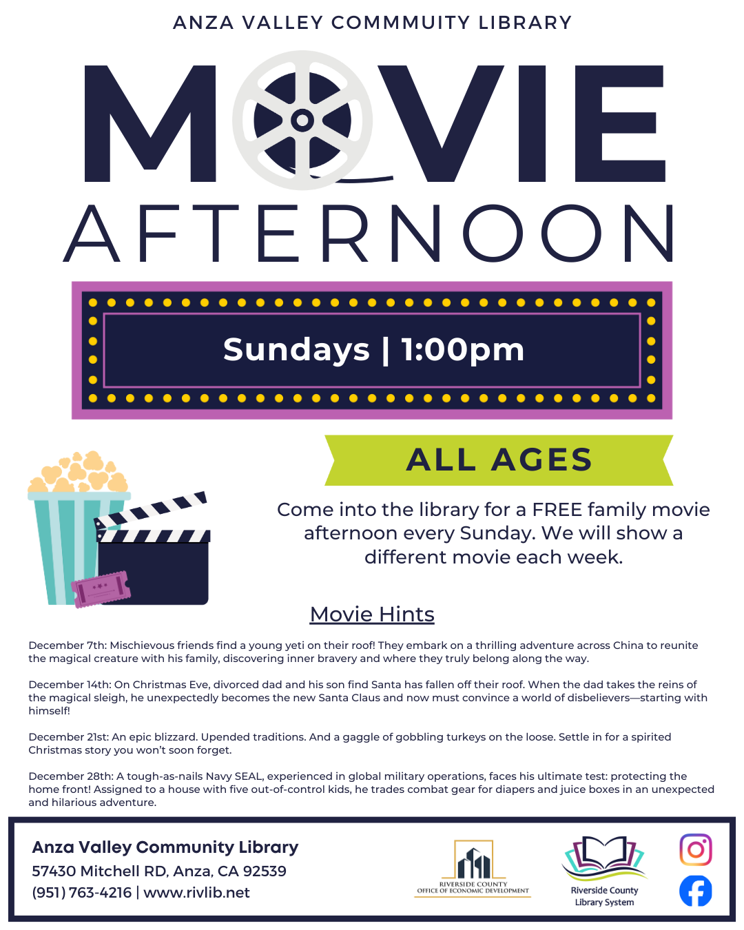 Come into the library for a FREE family movie afternoon each Sunday. A different movie will show each week.
