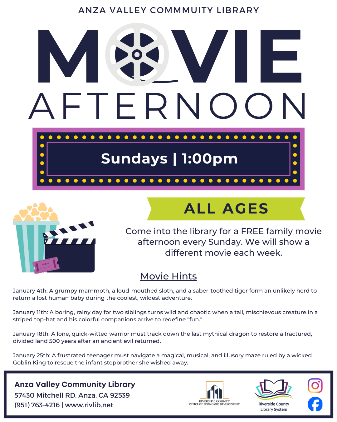 Come into the library for a FREE family movie afternoon each Sunday. A different movie will show each week.