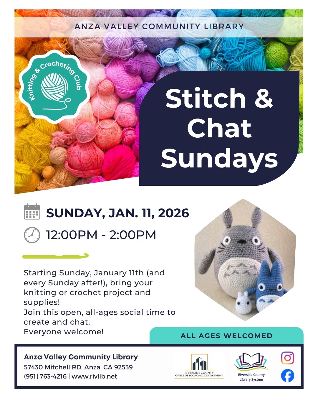 Beginning Sunday, January 11th come to the library to meet up with other knitters and crocheters to do some stitching while chatting. Bring your own projects and supplies, while all ages, genders and skill levels are welcome this is a meet up group to stitch and chat.