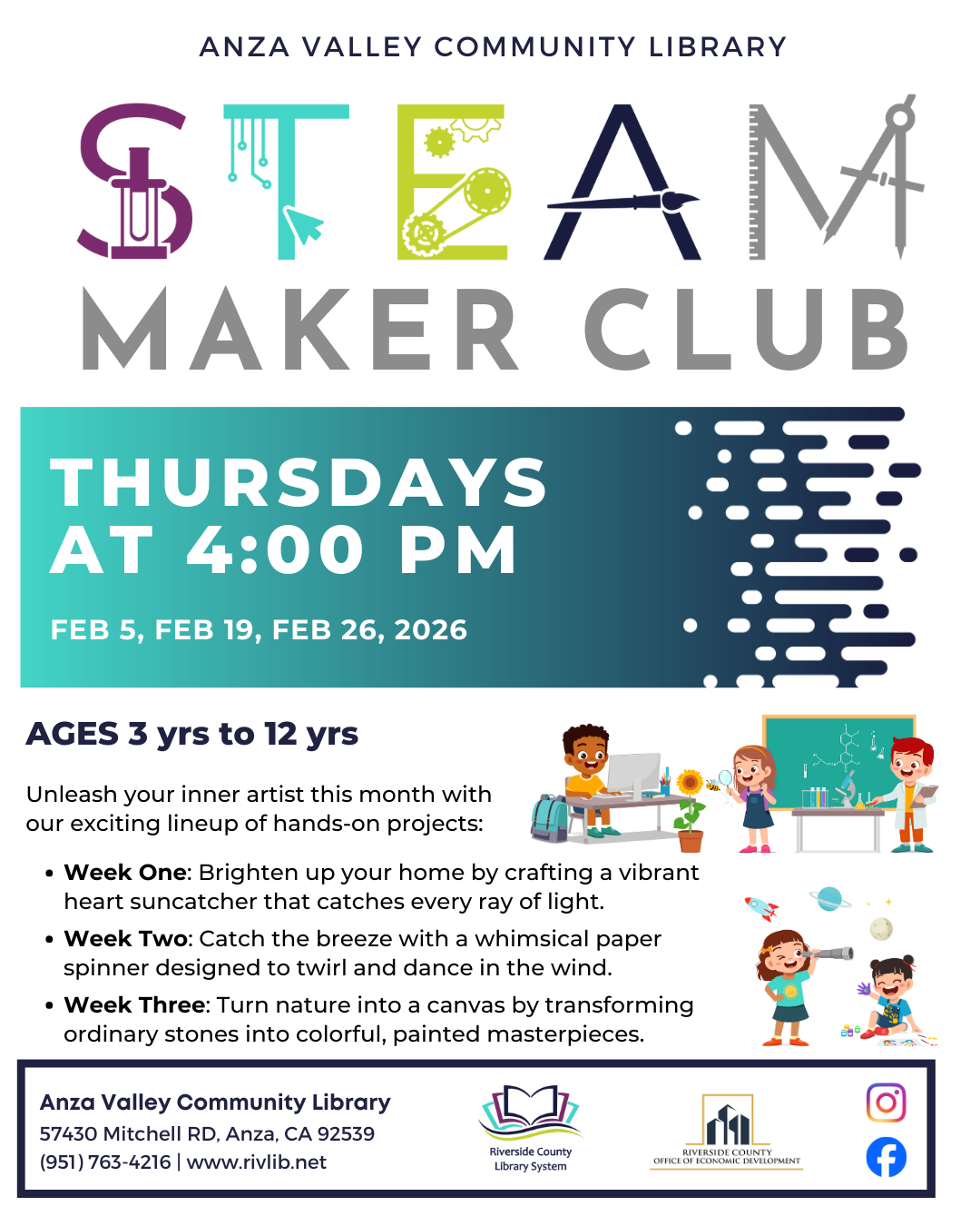 On Thursdays, we will have an activity based on S.T.E.A.M. These activities for children to learn something about Science, Technology, Engineering, Art or Math. All are welcome to join in, though younger children may need assistance from their parents