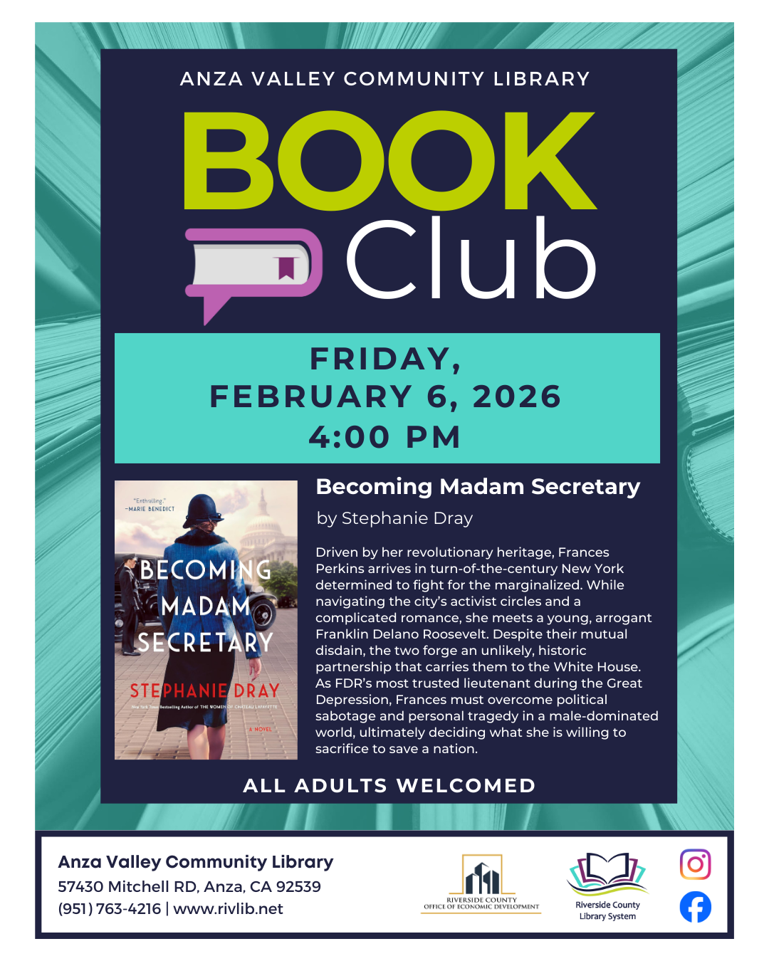 Join the FAB (Fabulous Adult Book) Club for this month's discussion on 'Becoming Madam Secretary' by Stephanie Dray.