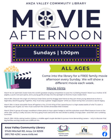Come into the library for a FREE family movie afternoon each Sunday. A different movie will show each week.