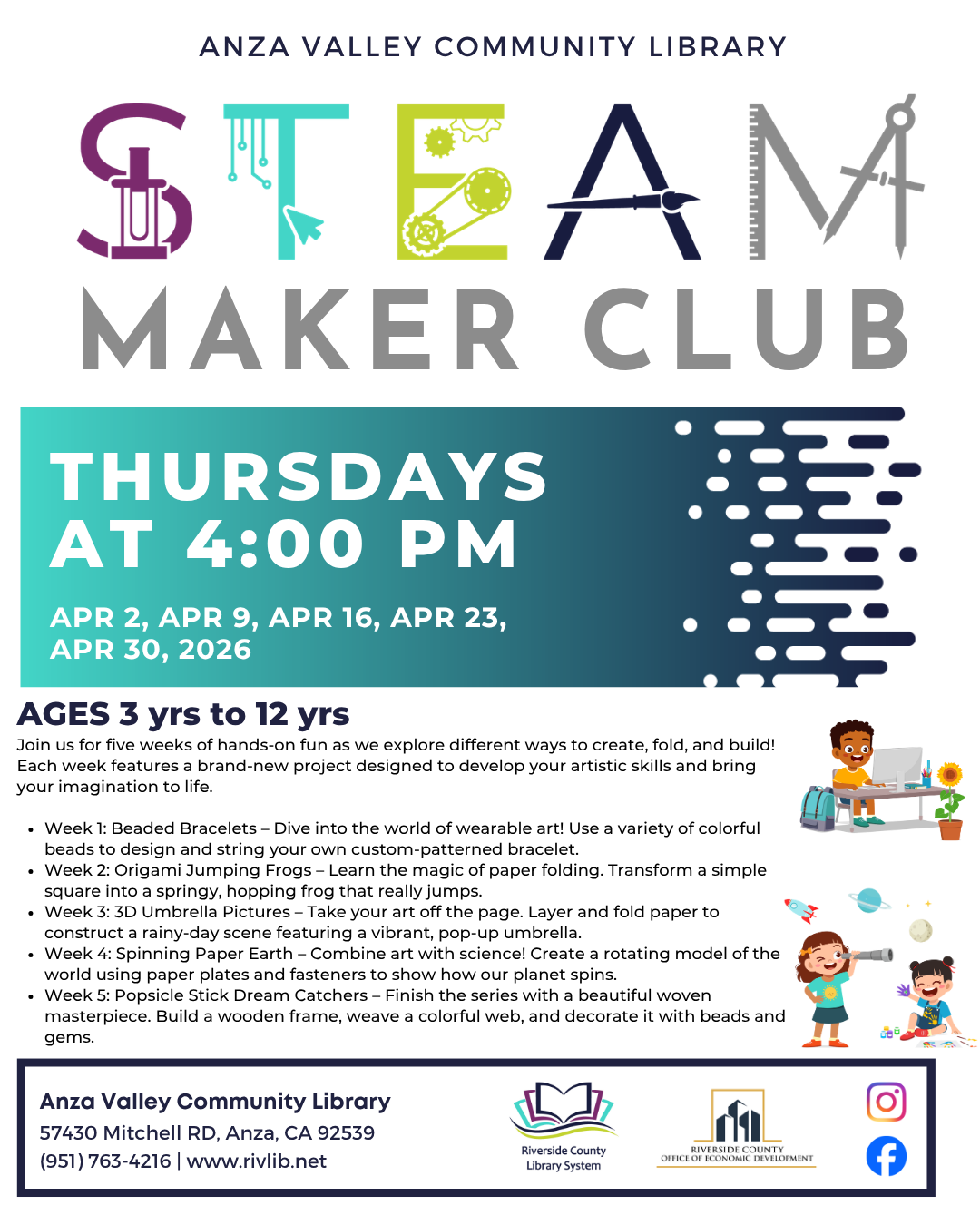 On Thursdays, we will have an activity based on S.T.E.A.M. These activities for children to learn something about Science, Technology, Engineering, Art or Math. All are welcome to join in, though younger children may need assistance from their parents