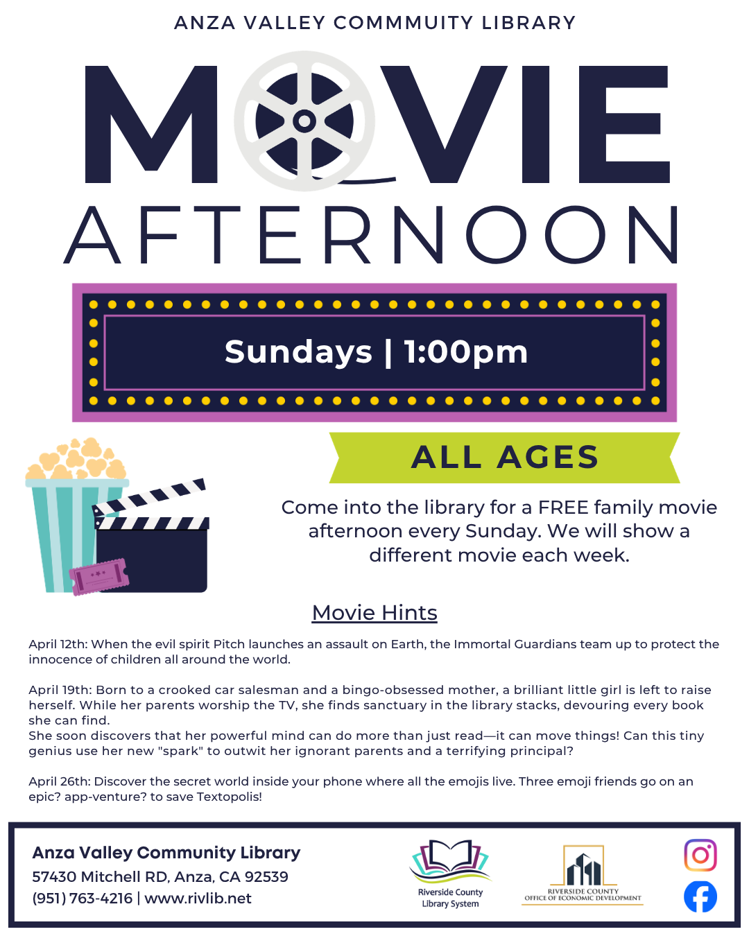 Come into the library for a FREE family movie afternoon each Sunday. A different movie will show each week.